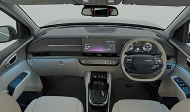 The Kia Carens Clavis features a 5-seater cabin with flexible cargo space, a dual-tone premium dashboard, and fabric or leatherette upholstery. It also offers ventilated front seats, rear AC vents, and flat-folding rear seats for added comfort and practicality, making it ideal for family journeys.